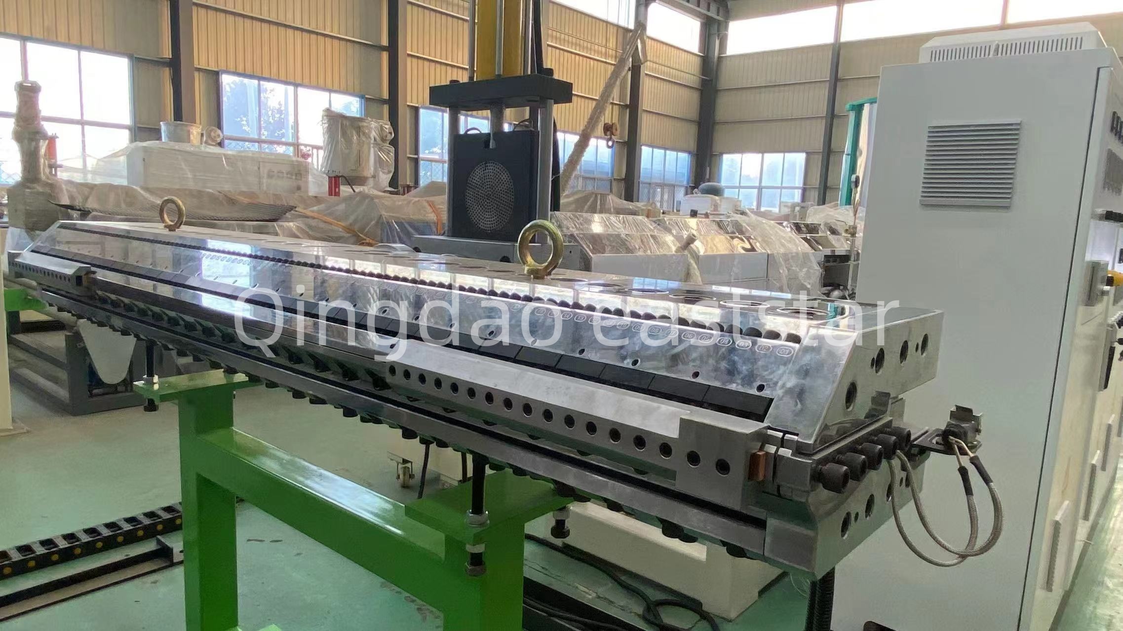 整條PE排水板設(shè)備還包含液壓換網(wǎng)器、熔體計量泵和6米冷卻托架。換網(wǎng)器采用單板式雙工位設(shè)計,實現(xiàn)不停機換網(wǎng)。計量泵規(guī)格150CC,配備18.5KW電機,確保熔體輸送穩(wěn)定。牽引機配備Φ250×1700mm丁腈橡膠輥,通過3KW電機驅(qū)動,實現(xiàn)平穩(wěn)牽引。