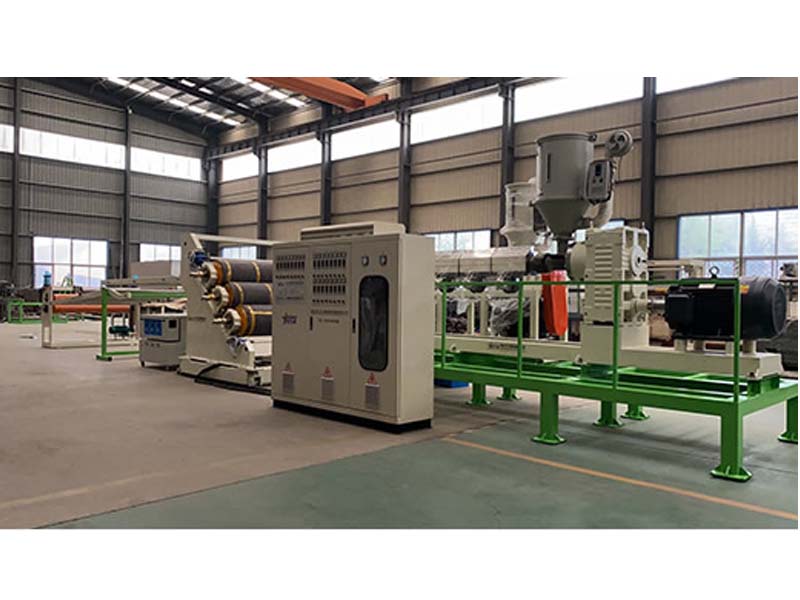 PP三層共擠片材生產(chǎn)線:可生產(chǎn)寬度750-1500毫米、厚度0.2-2毫米、單層/雙層/三層的塑料片材。該設(shè)備采SJ90-33/1和SJ75-30/1單螺桿擠出機(jī)、液壓自動(dòng)換網(wǎng)器、A+B+A三層共擠分配器、T型彈性??诳烧{(diào)模具、斜45度三輥壓光機(jī)、三合一水溫機(jī)、不銹鋼冷卻托架并裝有寬幅可調(diào)切邊刀、橡膠輥牽引機(jī)、雙工位氣漲軸收卷機(jī)。生產(chǎn)線采用符合人體工位學(xué)的電控柜:歐姆龍智能溫控系統(tǒng)、西門子低壓電器、國內(nèi)外馳名品牌變頻調(diào)速器。